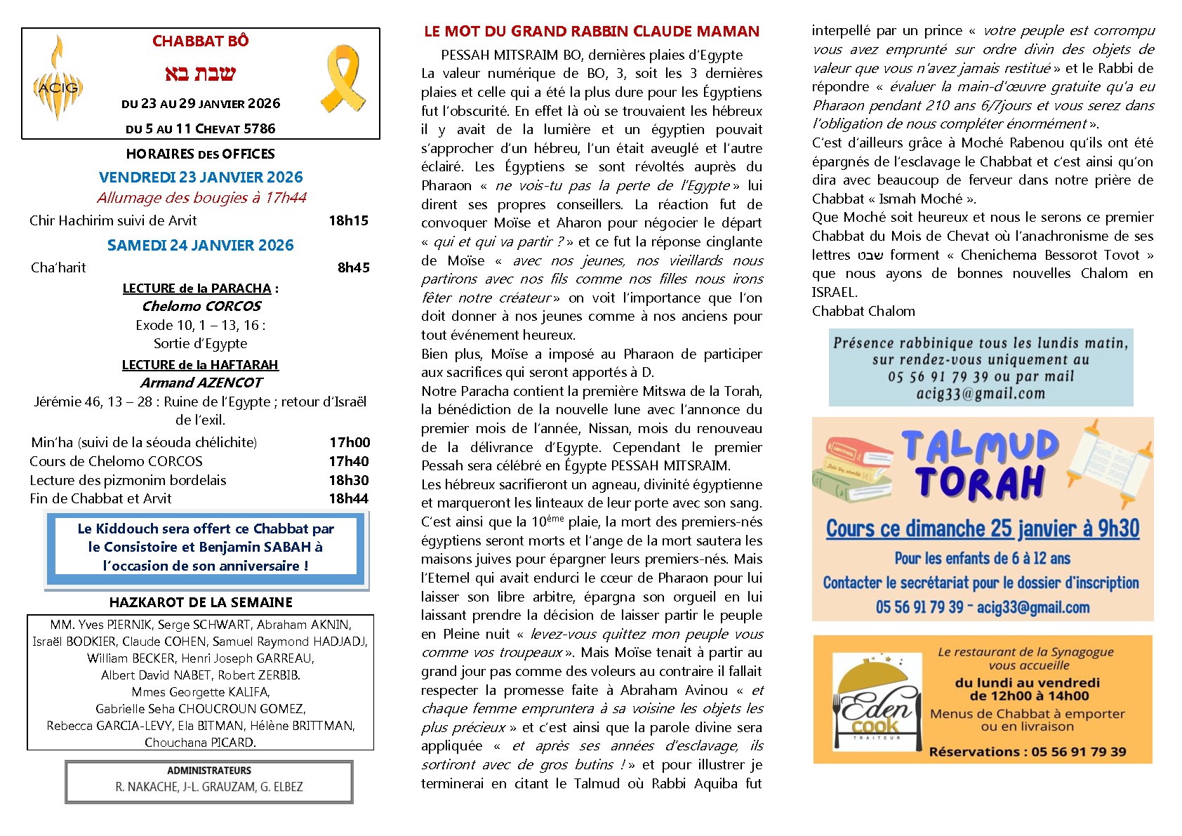 PARACHA DE LA SEMAINE CHABBAT BÔ שבת בא DU 23 AU 29 JANVIER 2026 DU 5 AU 11 CHEVAT 5786